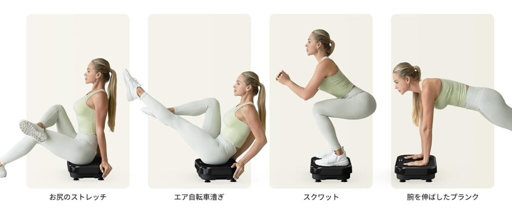 ブルブルマシンの上でスクワットやプランクを行うと、振動に耐えようとして普段使わないインナーマッスル(体幹)が強く活動します。これにより、同じ運動量でも負荷を高めることが可能です。また、運動前のウォーミングアップとして使うと、体がほぐれて動きやすくなります。